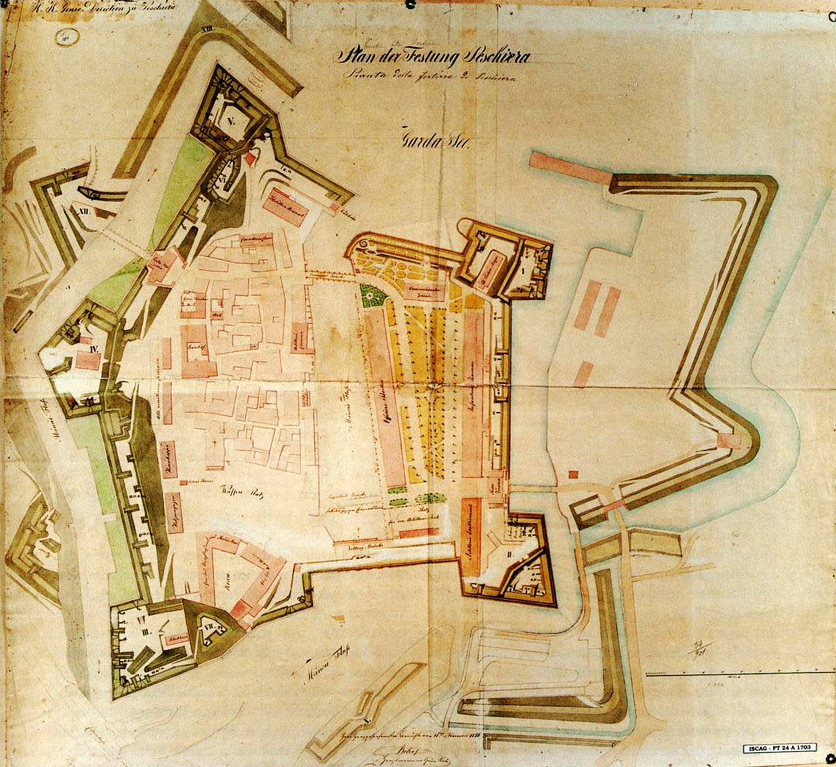 La città fortificata di Peschiera, sul lago di Garda, serviva da collegamento tra Venezia e i suoi territori più occidentali situati oltre il fiume Mincio. E’ caratterizzata da una pianta pentagonale e include il centro abitato ed elementi idrici come il Canale di Mezzo, ramificazione del Mincio, navigabile già al tempo dei romani. Quando la piazzaforte di Peschiera passò sotto il controllo della Repubblica di Venezia, le fortificazioni vennero rinnovate introducendo terrapieni e bastioni ai cinque angoli della cinta muraria medievale.