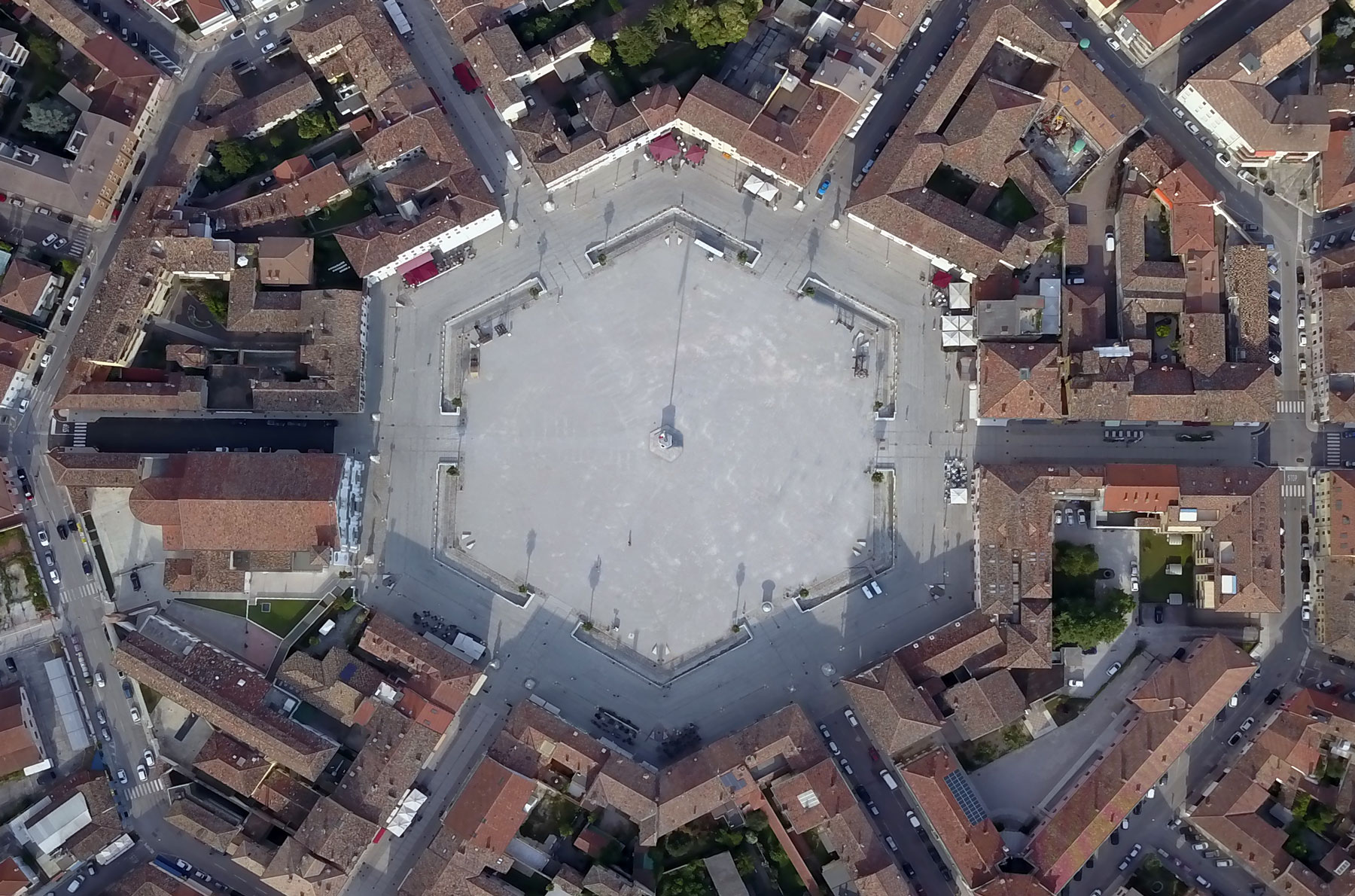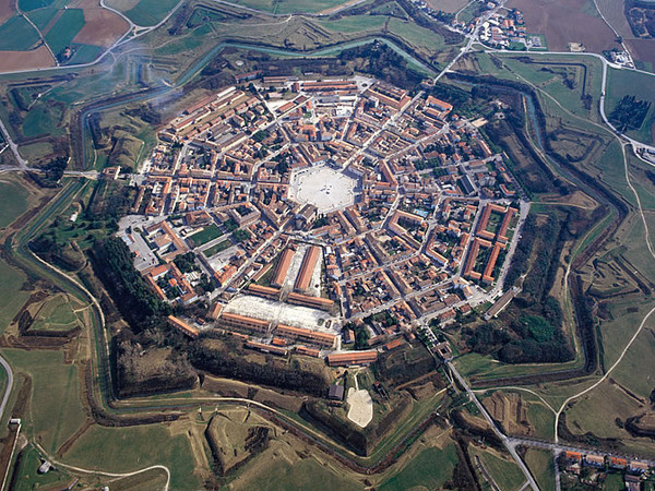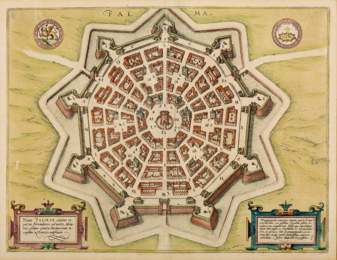 Palmanova fu fondata nel 1593 a nord di Aquileia, tra Venezia e Trieste, e progettata per ospitare ventimila persone. La fortezza della città, che doveva costituire il centro strategico per neutralizzare gli attacchi ottomani dall’Oriente e gli attacchi dall’Austria, si presenta come un nucleo urbano di 70 ettari contenuto all’interno di tre cinte murarie concentriche, due mura veneziane e il perimetro più esterno francese, che conferiscono a Palmanova la sua straordinaria forma a stella a nove punte. Oggi è uno degli esempi meglio conservati di architettura militare e di città ideale del Rinascimento.