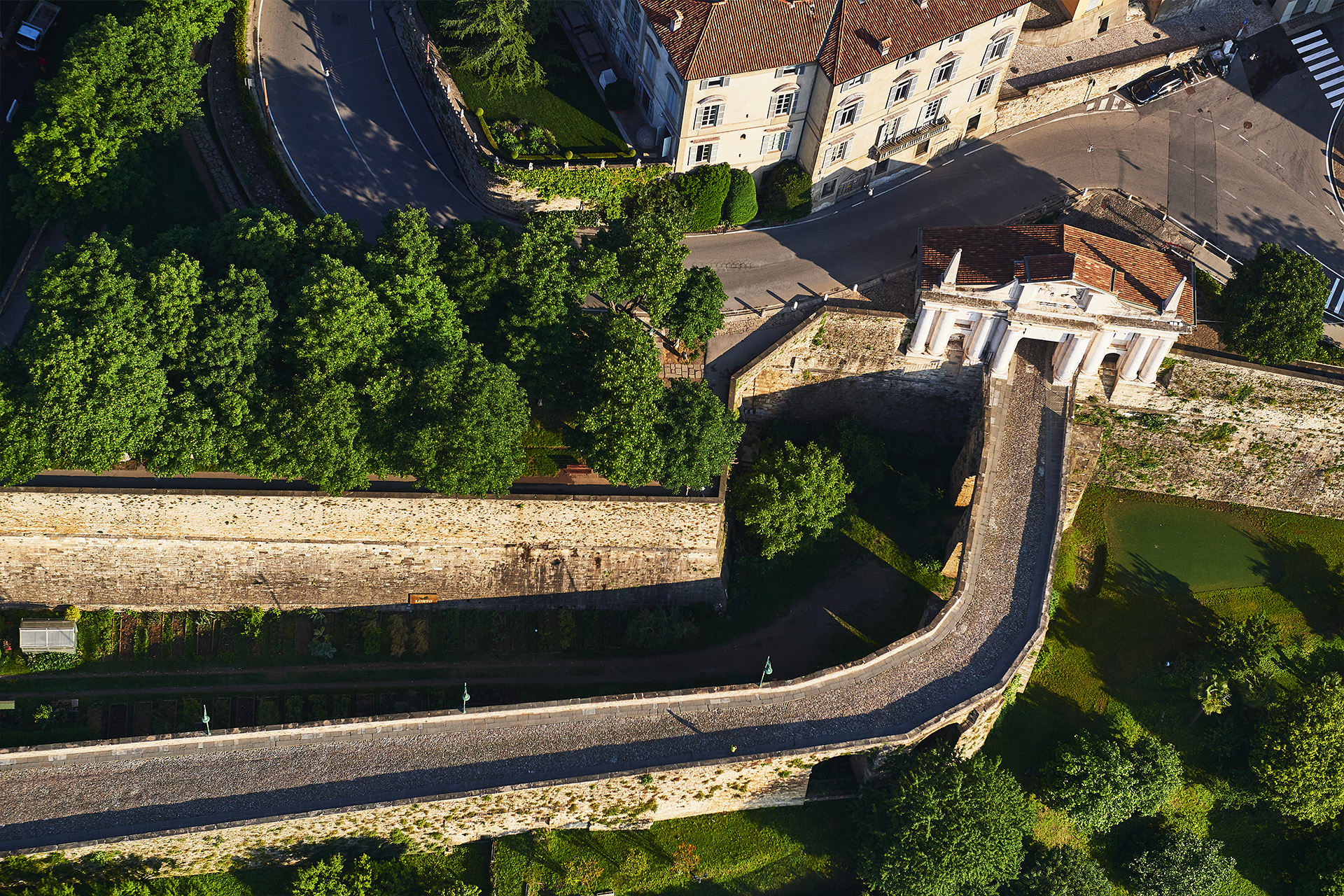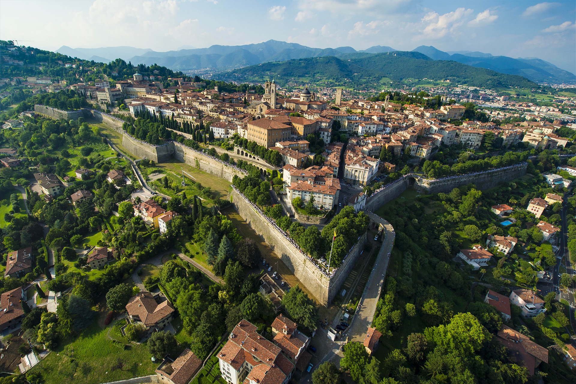La città fortificata di Bergamo, che si trova a nord est di Milano, rappresenta l’estremità più occidentale del sistema di difesa dello Stato di Terra della Serenissima e le sue fortificazioni, costruite fra il 1561 e il 1588, si sostituirono ai tratti ancora esistenti delle mura dell’epoca romana. Il perimetro comprende il sistema fortificato veneziano nella sua complessità di mura interne (bastionate) ed esterne, con elementi fortificati come i Forti di San Vigilio e di San Domenico e la Cittadella e la Rocca.